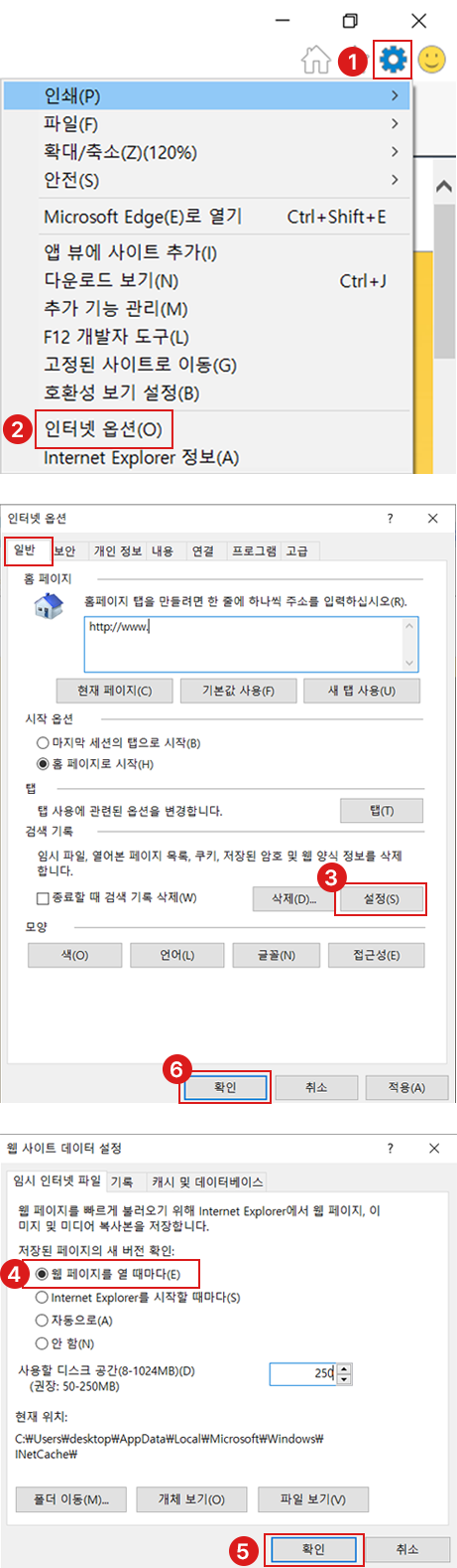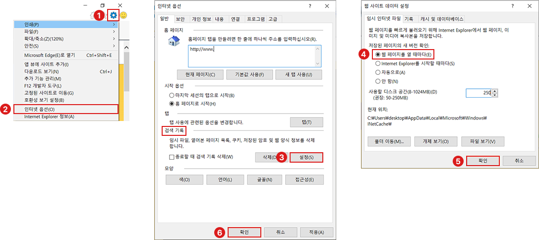 1. 익스플로러 설정 클릭 (보통 톱니바퀴 모양)